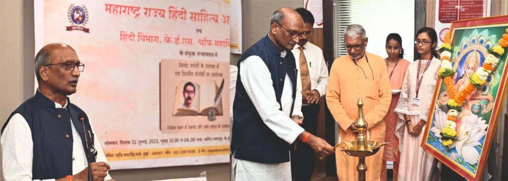 मुंबई। मुंबई के कांदिवली पश्चिम स्थित बी.के. श्रॉफ कला एवं एम.एच. श्रॉफ वाणिज्य महाविद्यालय के सभागार में सोमवार, 31 जुलाई, 2023 को कालजयी रचनाकार मुंशी प्रेमचंद जयंती के अवसर पर महाराष्ट्र राज्य हिंदी साहित्य अकादमी एवं महाविद्यालय के हिंदी विभाग के संयुक्त तत्वावधान में ‘वर्तमान समय में प्रेमचंद और उनके साहित्य की सार्थकता’ विषय पर एक दिवसीय संगोष्ठी का सफल आयोजन किया गया। संगोष्ठी में महाराष्ट्र राज्य के विभिन्न महाविद्यालयों के प्राध्यापक, साहित्यकार एवं विद्यार्थी उपस्थित थे। इस अवसर पर अपने प्रमुख सम्बोधन में महाराष्ट्र राज्य हिंदी साहित्य अकादमी के कार्याध्यक्ष डॉ शीतला प्रसाद दुबे ने कहा कि मुंशी प्रेमचंद मानवीय मूल्यों के सच्चे पुरस्कर्ता धे और उनका साहित्य संवेदनशील शब्दों के इतिहास में हमेशा अमर रहेगा। उन्होंने कहा कि अकादमी विभिन्न प्रमुख साहित्यकारों के व्यक्तित्व एवं रचनात्मक बिंदुओं पर आधारित कार्यक्रमों के समयानुकूल आयोजन के लिए हमेशा प्रतिबद्ध रही है और भविष्य में भी ऐसे सार्थक आयोजन निरंतर जारी रहेंगे।